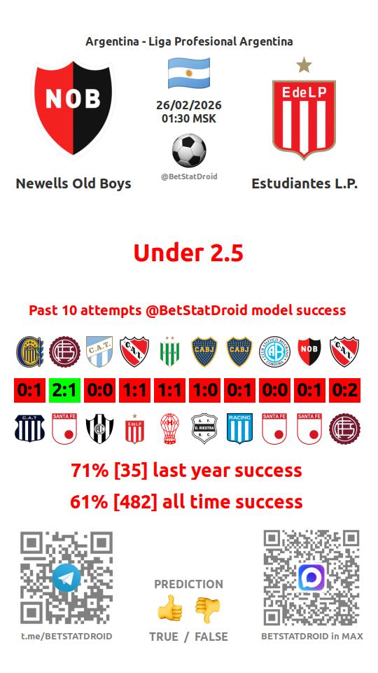 ✔ Ньюэллс Олд Бойз забивает меньше 2,5 голов в 40 матчах