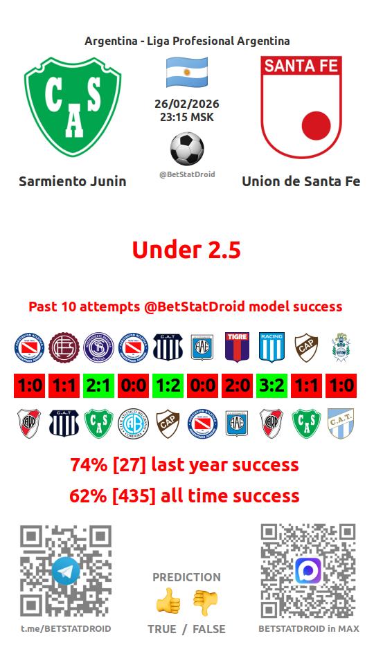 ✔ Унион Санта-Фе пропускает меньше 2,5 голов в 12 матчах