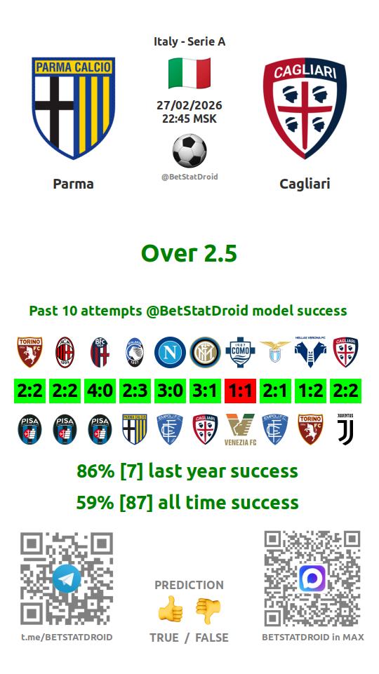 ✔ Парма забивает меньше 2,5 голов в 26 матчах
