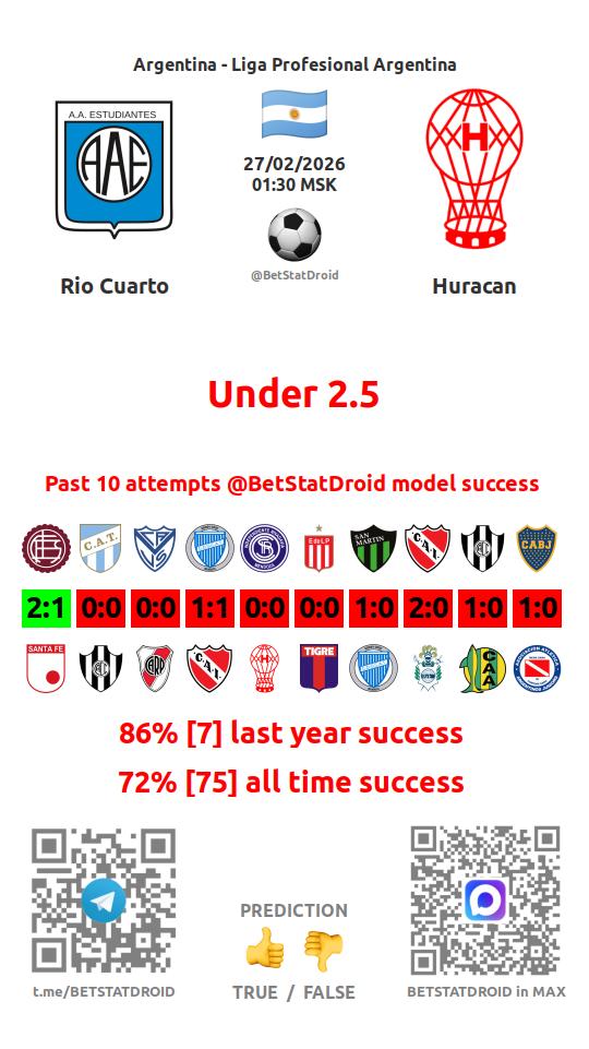✔ Уракан забивает меньше 2,5 голов в 10 матчах