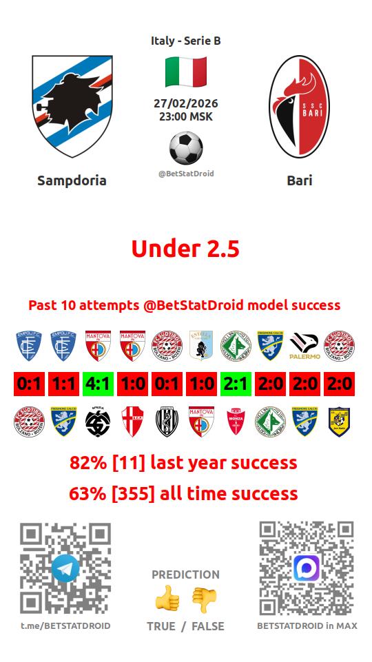 ✔ Бари забивает меньше 2,5 голов в 32 матчах