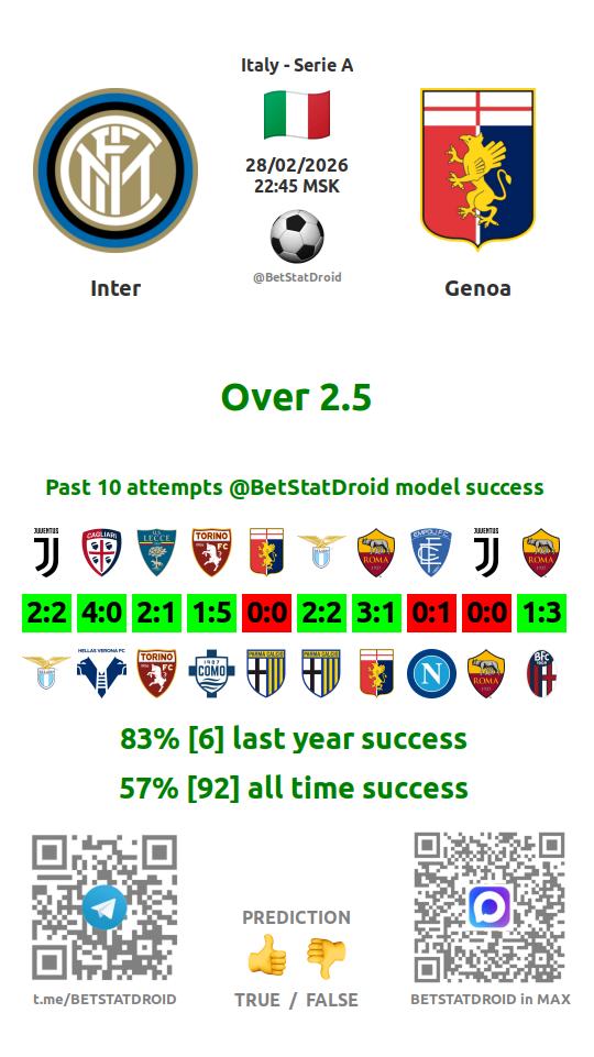 ✔ Интер пропускает меньше 2,5 голов в 27 матчах