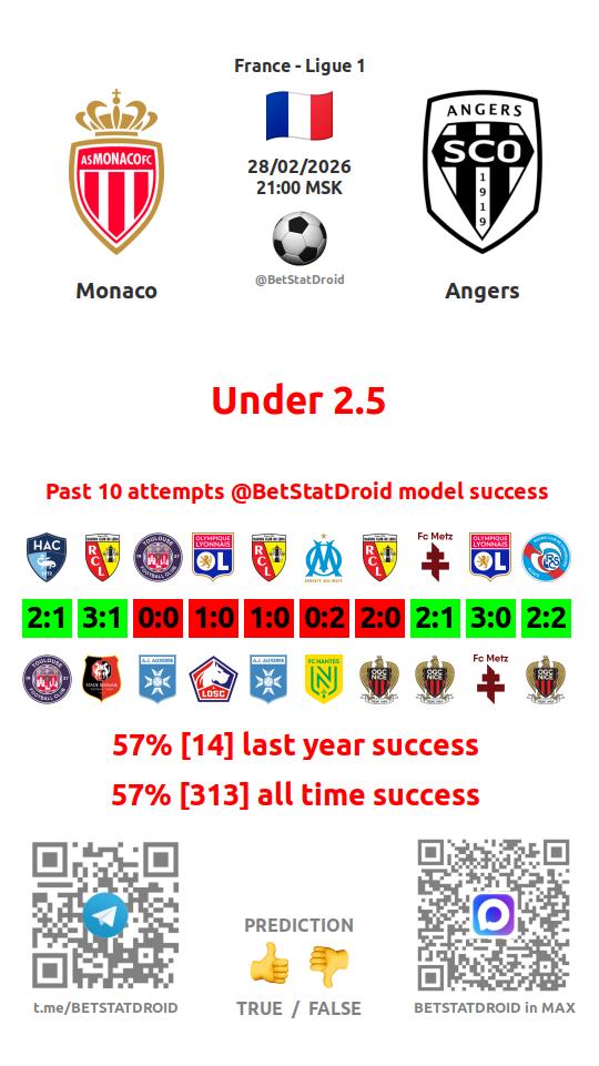 ✔ Анже забивает меньше 2,5 голов в 17 матчах