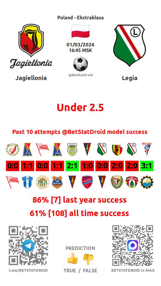 ✔ Ягеллония забивает меньше 2,5 голов в 26 матчах