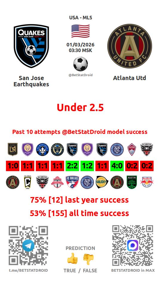 ✔ Атланта Юнайтед забивает меньше 1,5 голов в 6 матчах