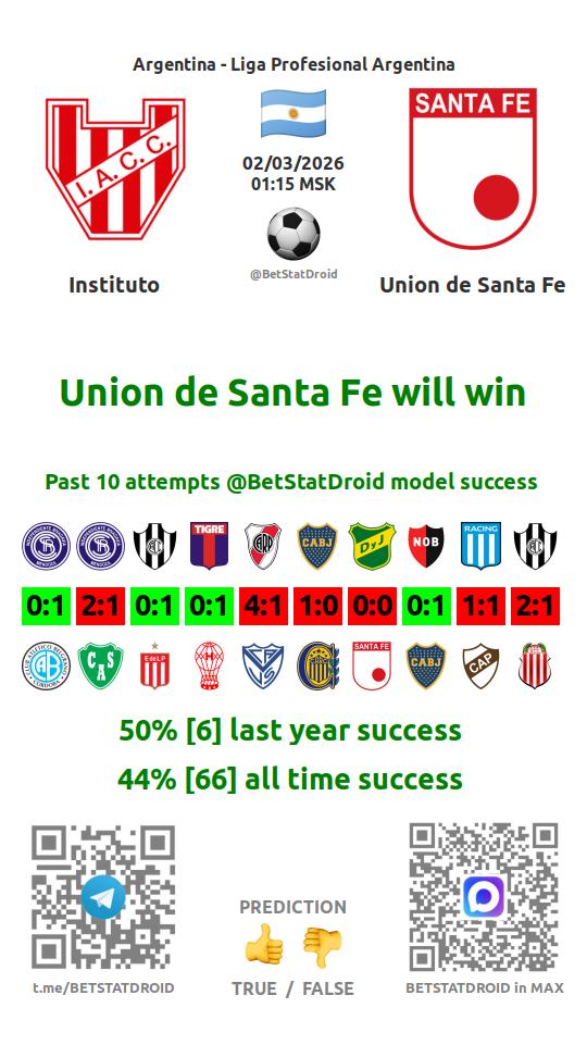 ✔ Институто забивает меньше 2,5 голов в 28 матчах