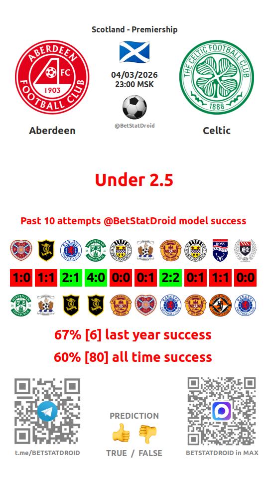 ✔ Абердин забивает меньше 1,5 голов в 6 матчах