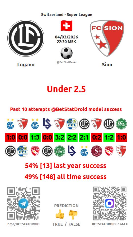 ✔ Лугано пропускает меньше 2,5 голов в 13 матчах