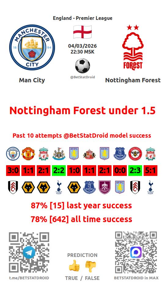 ✔ Ноттингем Форест забивает меньше 1,5 голов в 8 матчах