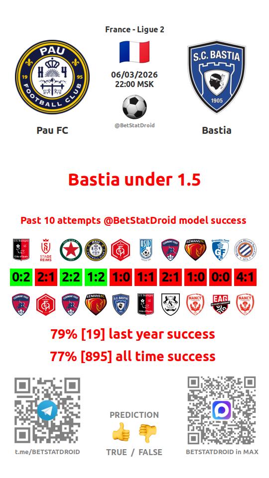 ✔ Бастия забивает меньше 1,5 голов в 6 матчах