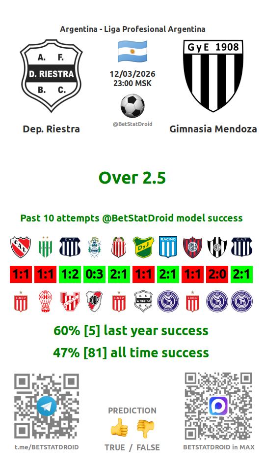 ✔ Депортиво Риестра забивает меньше 2,5 голов в 10 матчах