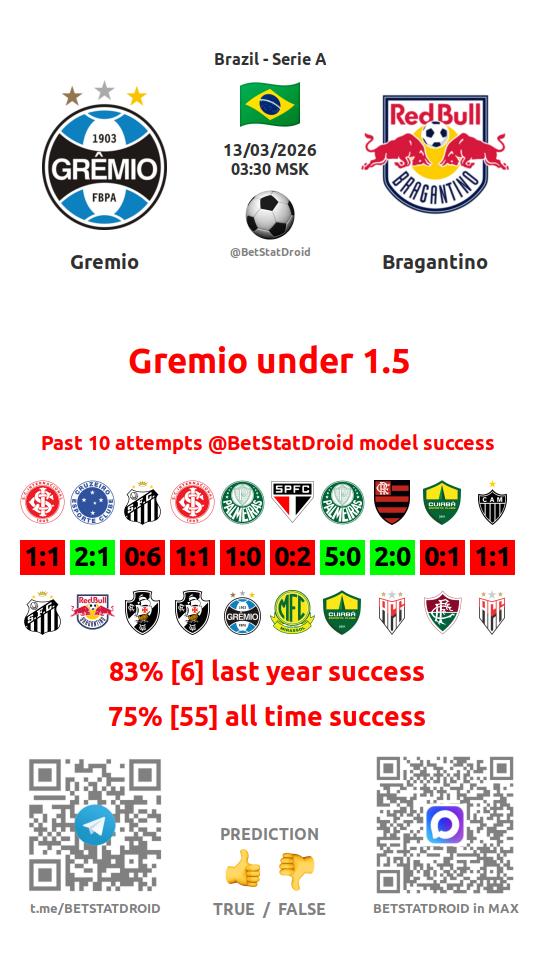 ✔ Ред Булл Брагантино забивает меньше 2,5 голов в 46 матчах