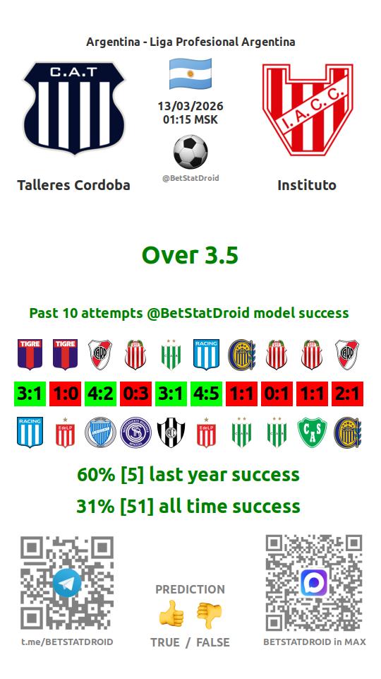 ✔ Институто забивает меньше 2,5 голов в 37 матчах