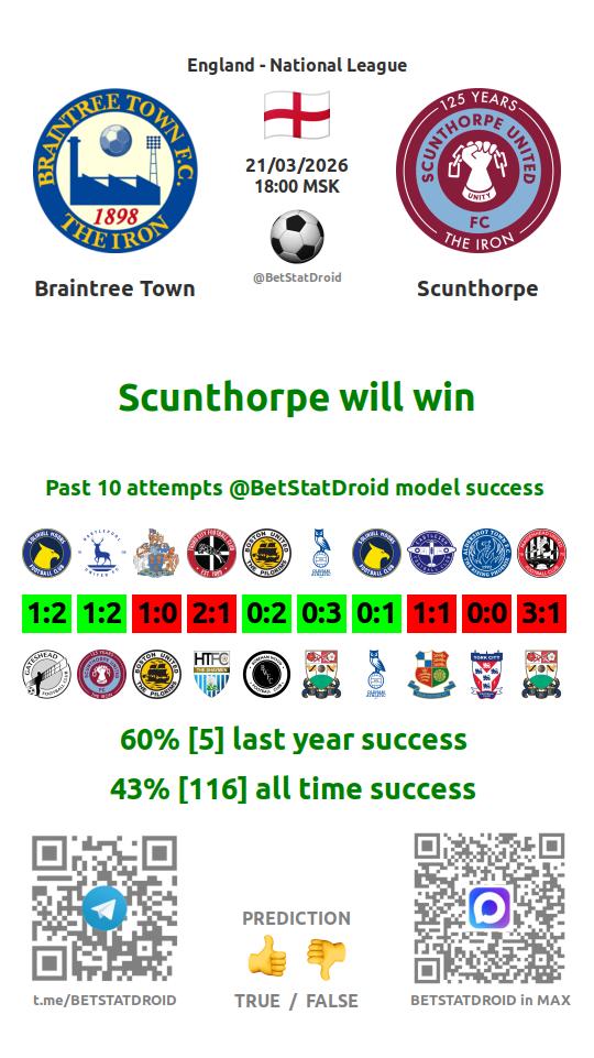 ✔ Брэйнтри Таун забивает меньше 2,5 голов в 18 матчах