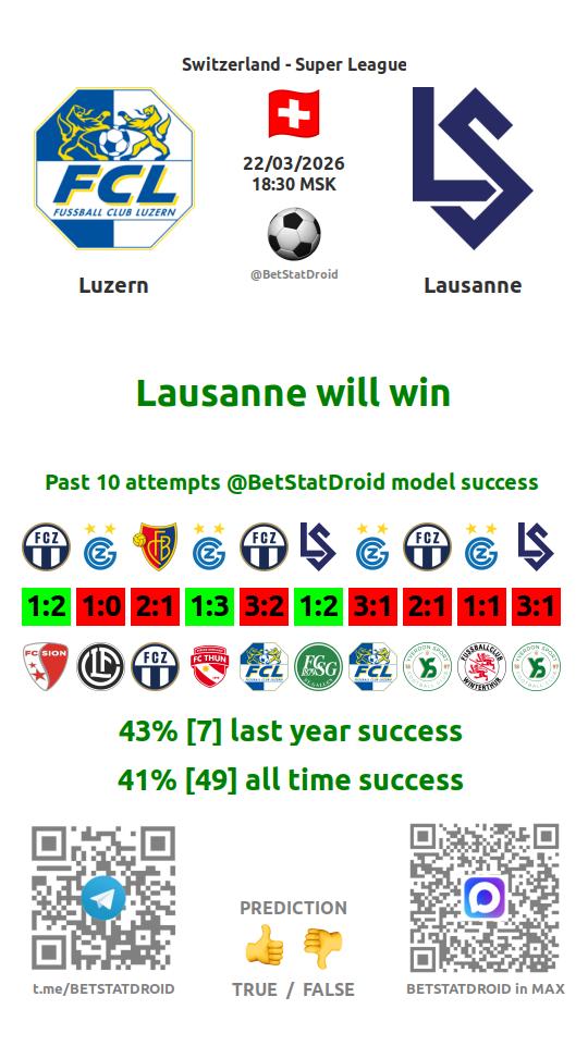 ✔ Лозанна забивает меньше 2,5 голов в 10 матчах