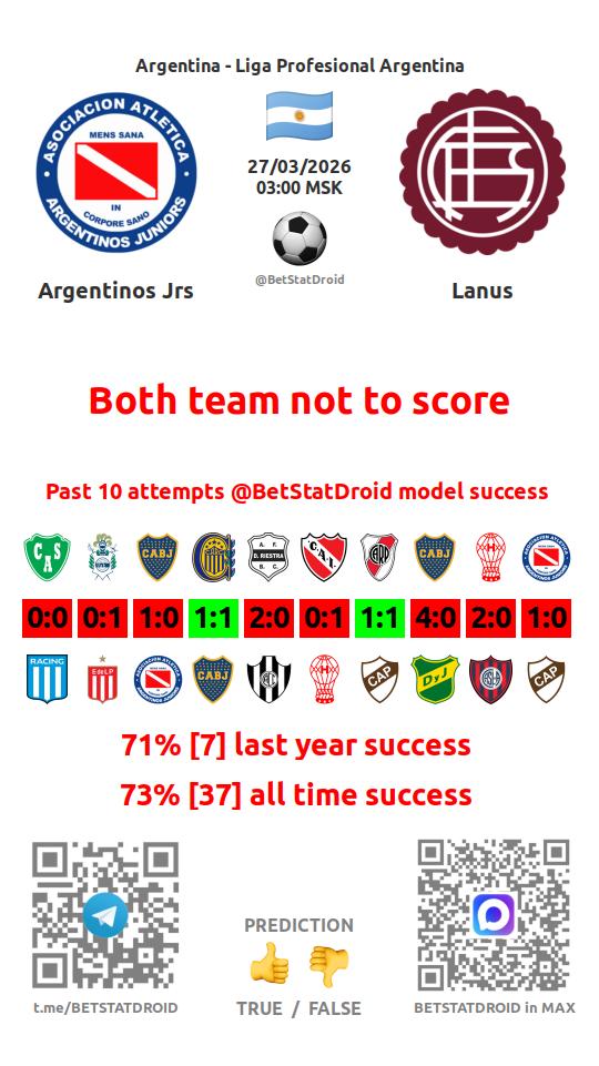 ✔ Архентинос Хуниорс забивает меньше 1,5 голов в 7 матчах