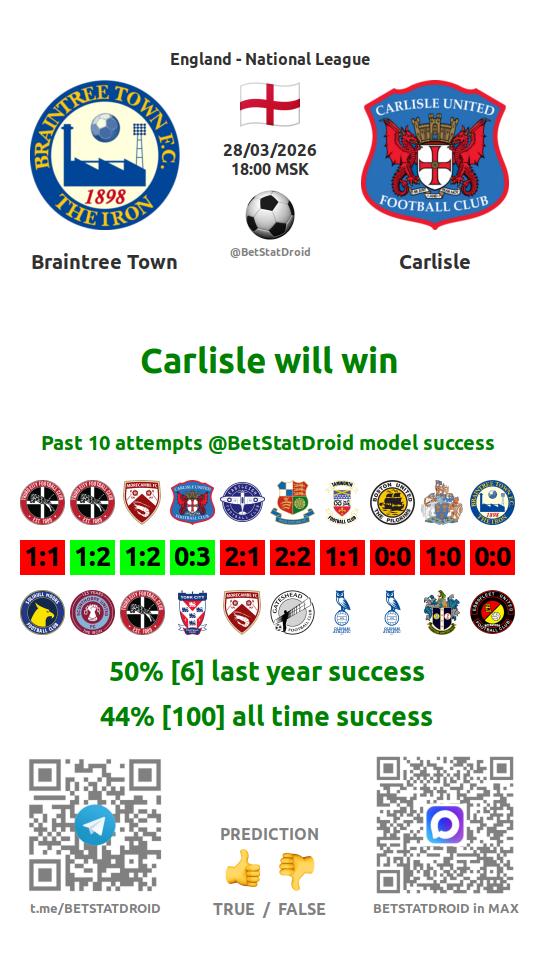 ✔ Брэйнтри Таун забивает меньше 2,5 голов в 19 матчах