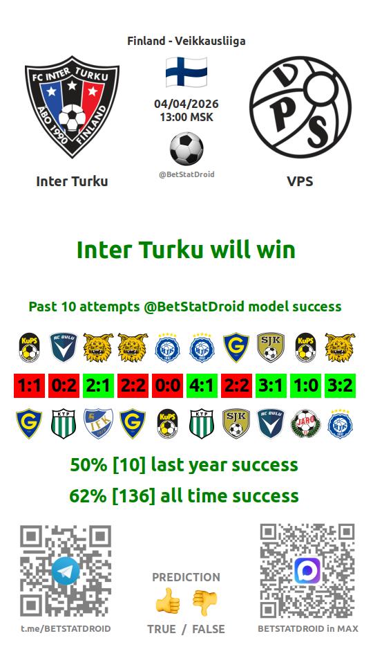 ✔ Интер Турку забивает меньше 2,5 голов в 13 матчах