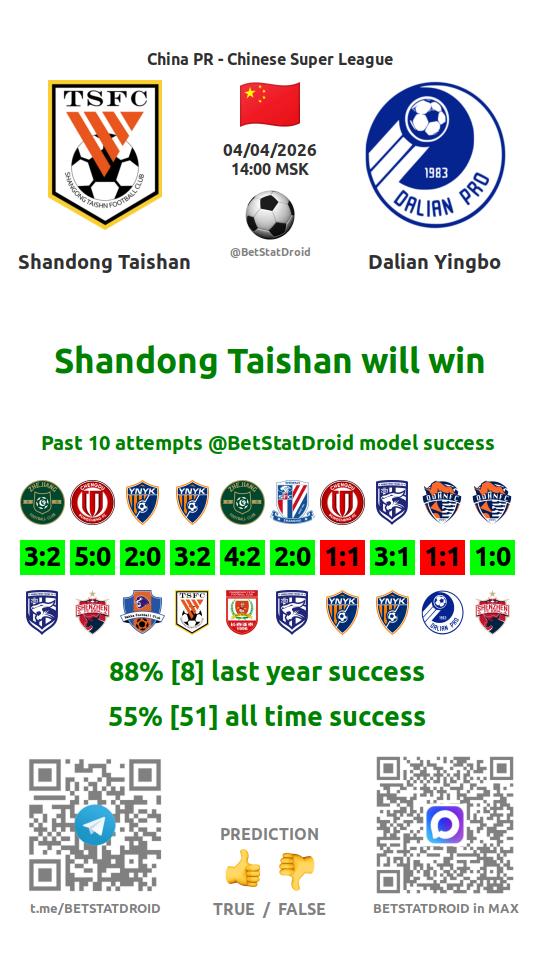 ✔ Шаньдун Тайшань выигрывает в 4 матчах