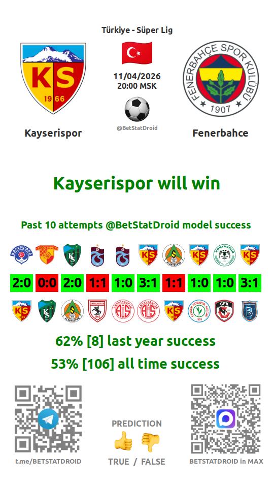 ✔ Кайсериспор забивает меньше 1,5 голов в 16 матчах