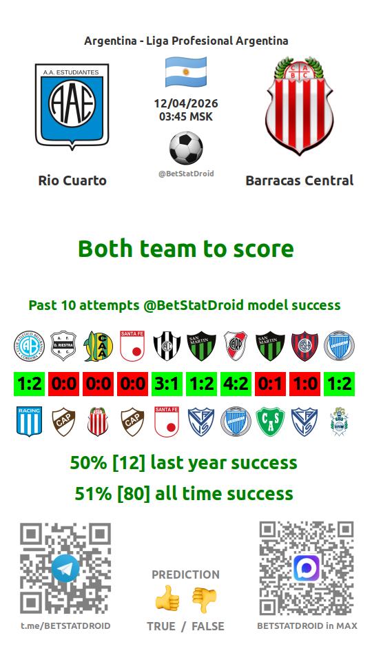 ✔ Барракас Сентраль забивает меньше 2,5 голов в 13 матчах