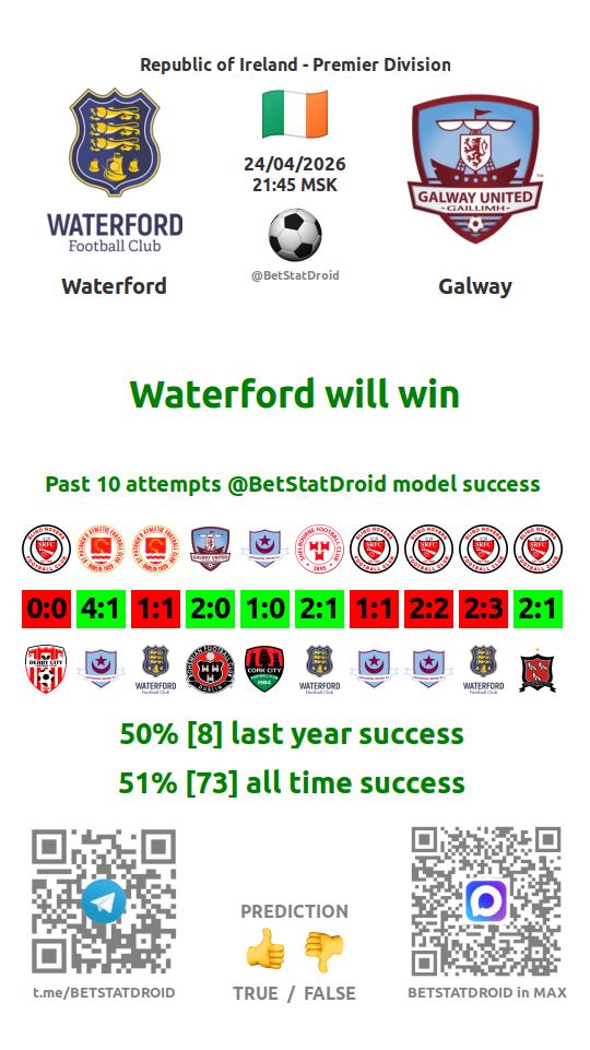✔ Уотерфорд Юнайтед не выигрывает в 7 матчах