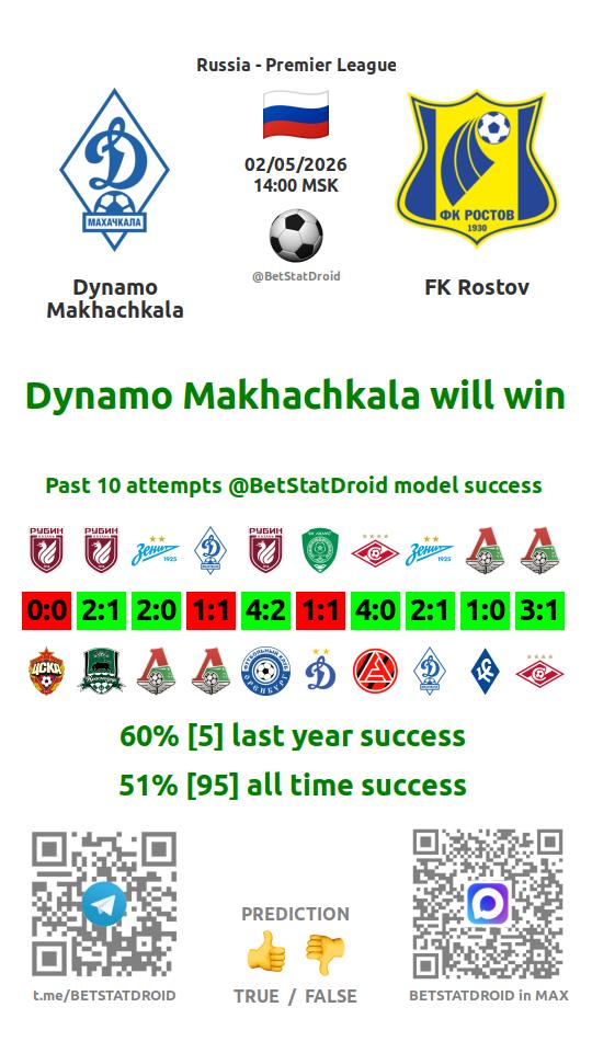 ✔ Динамо Махачкала забивает меньше 2,5 голов в 34 матчах
