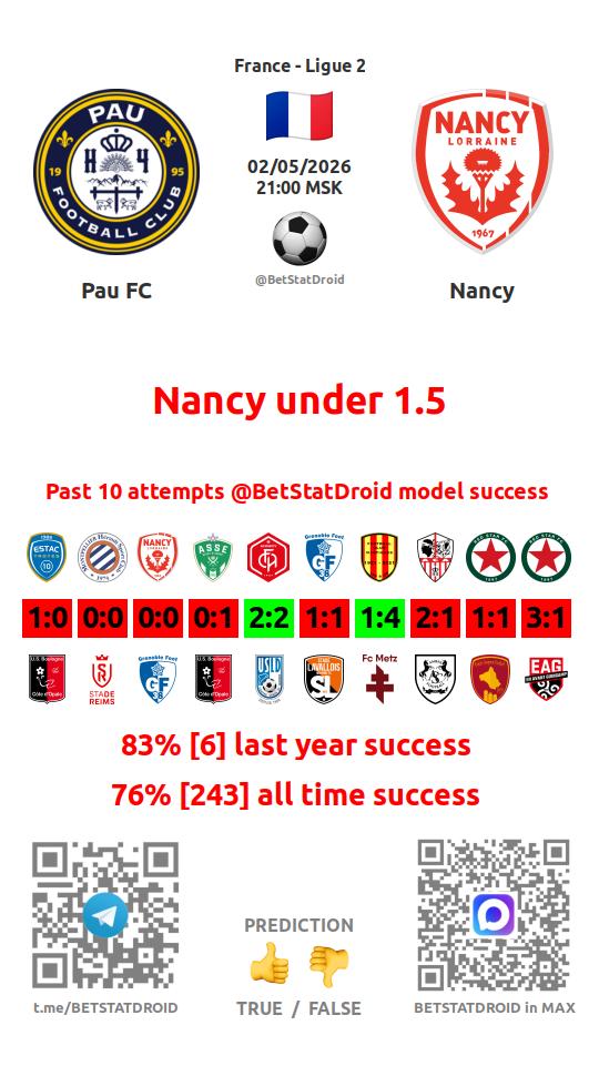 ✔ Нанси забивает меньше 2,5 голов в 14 матчах