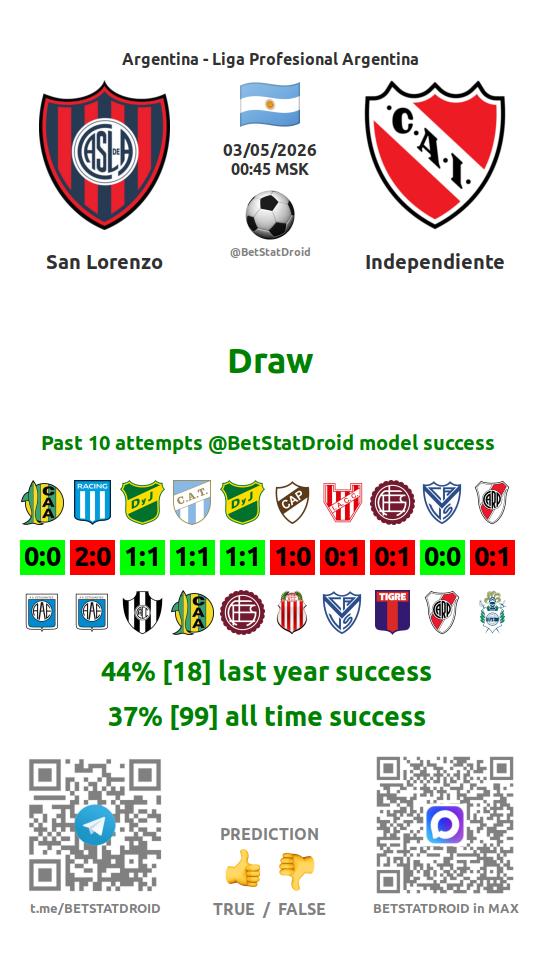 ✔ Сан-Лоренсо забивает меньше 2,5 голов в 44 матчах
