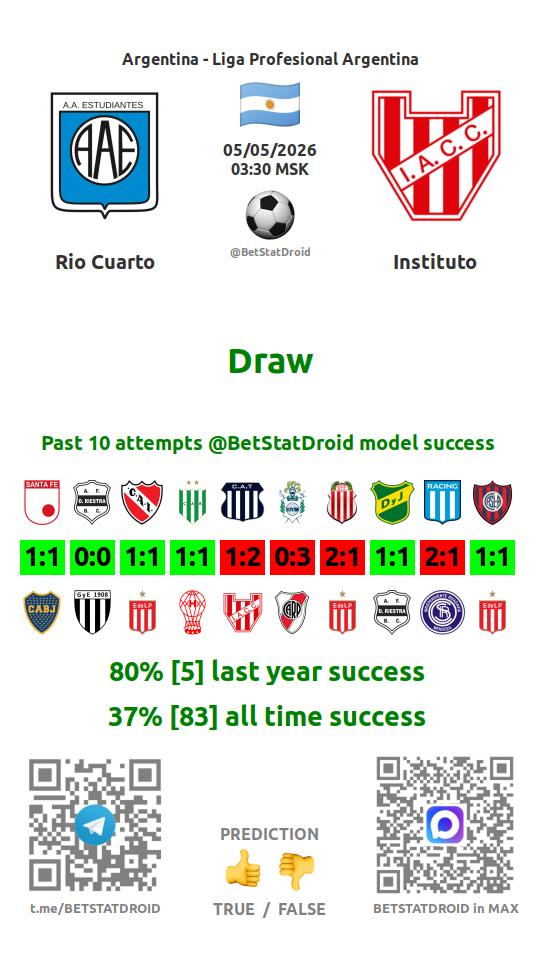 ✔ Институто забивает меньше 2,5 голов в 37 матчах